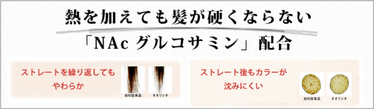 ミルボンのネオリシオは、今までのストレート剤の悩みの種だった熱ダメージを抑制する成分が配合されています。タンパク質を変性体でとどめ、熱凝縮を抑制する「NAcグルコサミン」が凝縮体を抑える働きをすることで、毛先まで柔らかい質感に変わります。